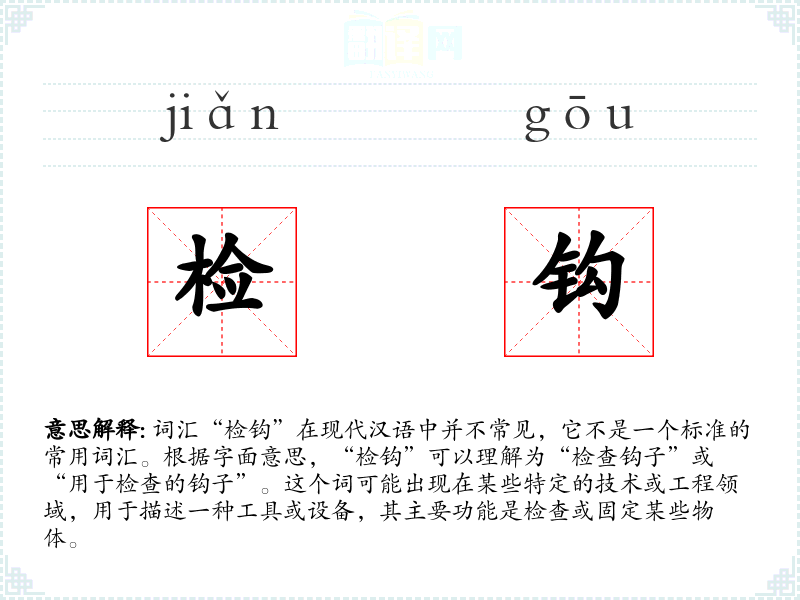 词汇“检钩”在现代汉语中并不常见,它不是一个标准的常用词汇。根据字面意思,“检钩”可以理解为“检查钩子”或“用于检查的钩子”。这个词可能出现在某些特定的技术或工程领域,用于描述一种工具或设备,其主要功能是检查或固定某些物体。