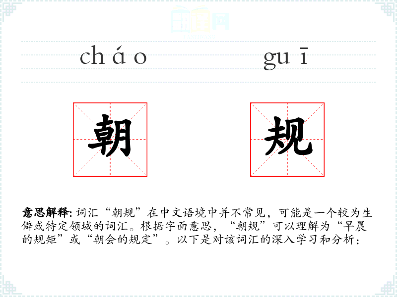 词汇“朝规”在中文语境中并不常见,可能是一个较为生僻或特定领域的词汇。根据字面意思,“朝规”可以理解为“早晨的规矩”或“朝会的规定”。以下是对该词汇的深入学*和分析: