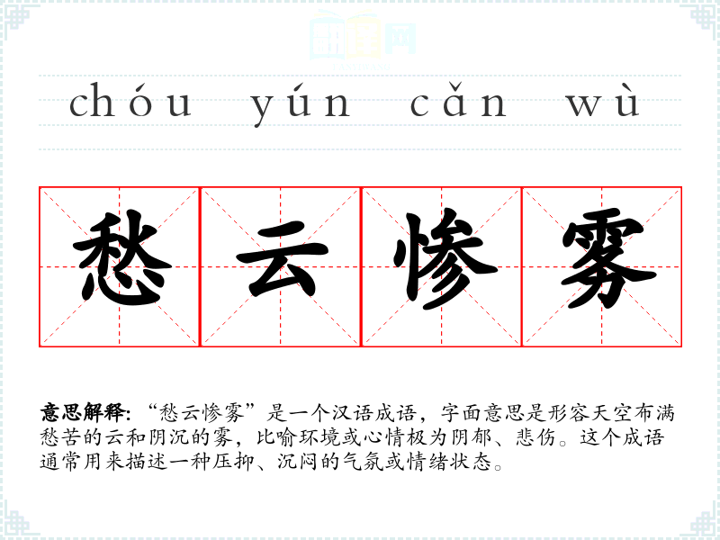 “愁云惨雾”是一个汉语成语,字面意思是形容天空布满愁苦的云和阴沉的雾,比喻环境或心情极为阴郁、悲伤。这个成语通常用来描述一种压抑、沉闷的气氛或情绪状态。