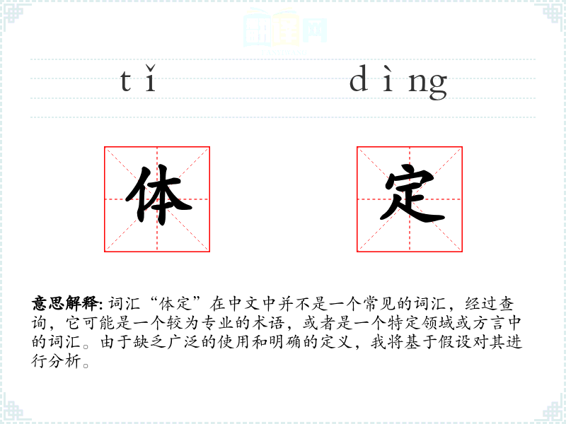 词汇“体定”在中文中并不是一个常见的词汇,经过查询,它可能是一个较为专业的术语,或者是一个特定领域或方言中的词汇。由于缺乏广泛的使用和明确的定义,我将基于假设对其进行分析。