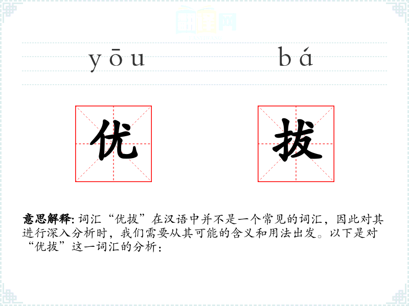 词汇“优拔”在汉语中并不是一个常见的词汇,因此对其进行深入分析时,我们需要从其可能的含义和用法出发。以下是对“优拔”这一词汇的分析: