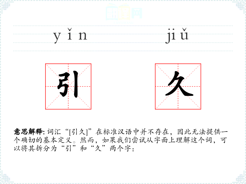 词汇“[引久]”在标准汉语中并不存在,因此无法提供一个确切的基本定义。然而,如果我们尝试从字面上理解这个词,可以将其拆分为“引”和“久”两个字: