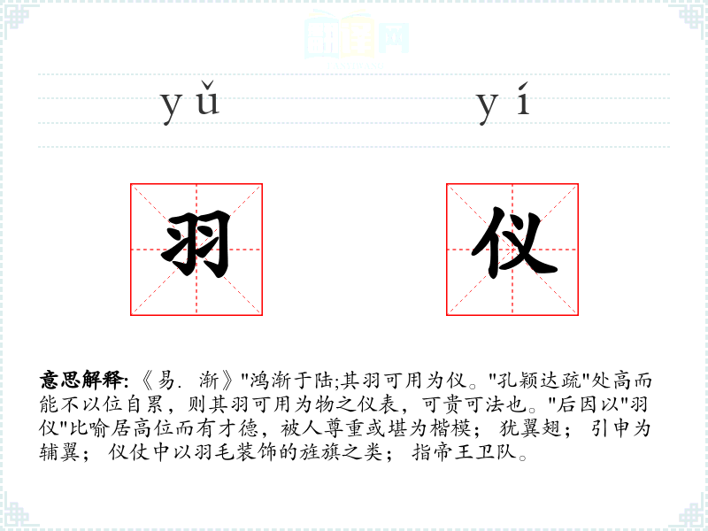 1.《易.渐》"鸿渐于陆;其羽可用为仪。"孔颖达疏"处高而能不以位自累,则其羽可用为物之仪表,可贵可法也。"后因以"羽仪"比喻居高位而有才德,被人尊重或堪为楷模; 犹翼翅; 引申为辅翼; 仪仗中以羽毛装饰的旌旗之类; 指帝王卫队。
