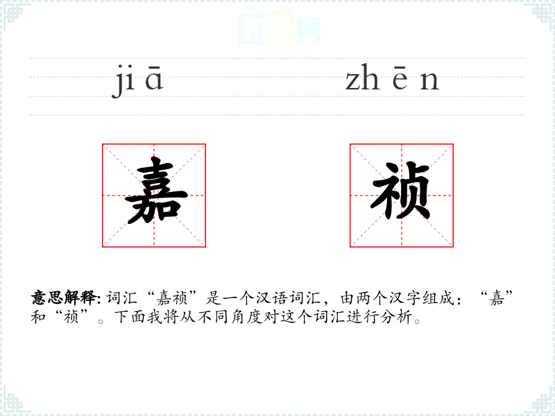 词汇“嘉祯”是一个汉语词汇,由两个汉字组成:“嘉”和“祯”。下面我将从不同角度对这个词汇进行分析。