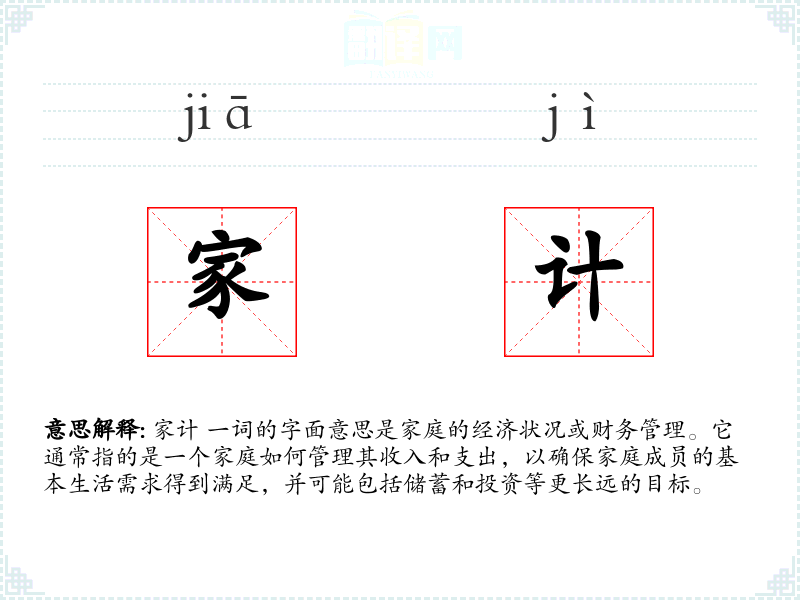 家计 一词的字面意思是家庭的经济状况或财务管理。它通常指的是一个家庭如何管理其收入和支出,以确保家庭成员的基本生活需求得到满足,并可能包括储蓄和投资等更长远的目标。