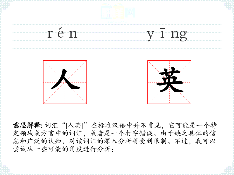 综上所述,由于“[人英]”不是一个已知或常见的词汇,对其进行深入分析是困难的。如果这是一个特定领域或方言中的词汇,建议提供更多的上下文信息以便进行更准确的分析。