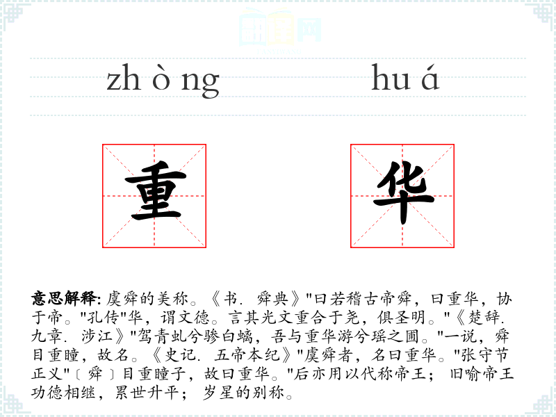 虞舜的美称。《书.舜典》"曰若稽古帝舜,曰重华,协于帝。"孔传"华,谓文德。言其光文重合于尧,俱圣明。"《楚辞.九章.涉江》"驾青虬兮骖白螭,吾与重华游兮瑶之圃。"一说,舜目重瞳,故名。《史记.五帝本纪》"虞舜者,名曰重华。"张守节正义"﹝舜﹞目重瞳子,故曰重华。"后亦用以代称帝王; 旧喻帝王功德相继,累世升平; 岁星的别称。