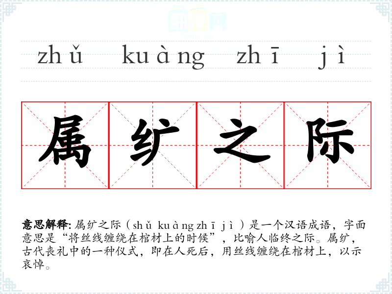 属纩之际(shǔ kuàng zhī jì)是一个汉语成语,字面意思是“将丝线缠绕在棺材上的时候”,比喻人临终之际。属纩,古代丧礼中的一种仪式,即在人死后,用丝线缠绕在棺材上,以示哀悼。