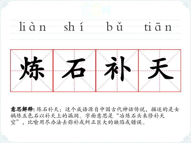 炼石补天这个成语不仅是一个生动的比喻,也是*文化中坚韧和创造力的象征。在语言学和表达中,它提供了一个强有力的形象,用以描述人们在面对挑战时的决心和努力。