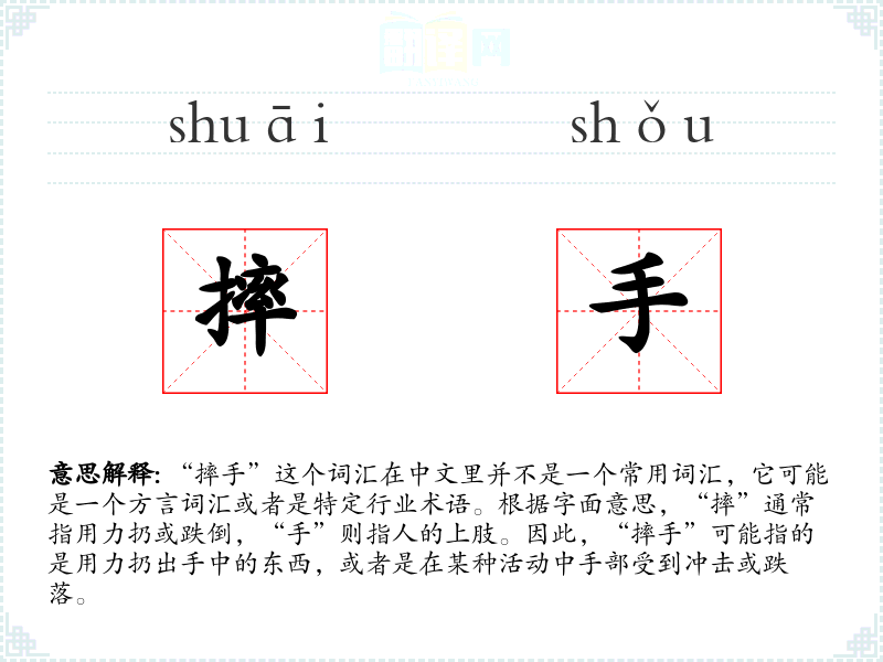 由于“摔手”不是一个标准汉语词汇,其词源和演变可能与特定地区的方言或行业术语相关。在普通话中,这个词汇并不常见,因此其历史演变可能不太为人所知。