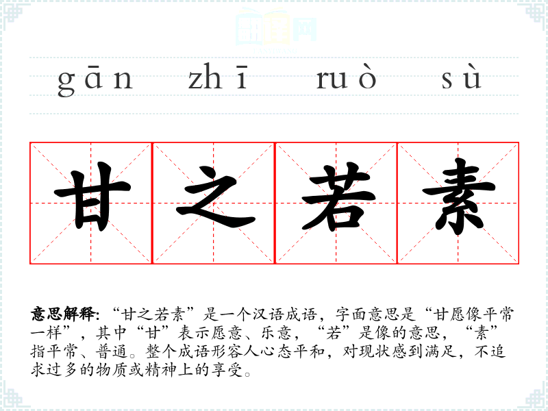 “甘之若素”是一个汉语成语,字面意思是“甘愿像平常一样”,其中“甘”表示愿意、乐意,“若”是像的意思,“素”指平常、普通。整个成语形容人心态平和,对现状感到满足,不追求过多的物质或精神上的享受。