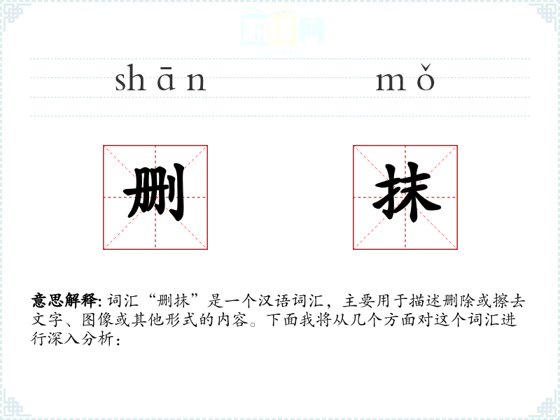 词汇“删抹”是一个汉语词汇,主要用于描述删除或擦去文字、图像或其他形式的内容。下面我将从几个方面对这个词汇进行深入分析: