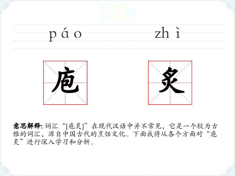“庖”字最早见于甲骨文,原意为厨房,后来指厨师。“炙”字则源自古代的烤肉方式,如《说文解字》中解释为“炮肉也”。随着时间的推移,“庖炙”逐渐成为一个表示烹饪技艺的词汇。