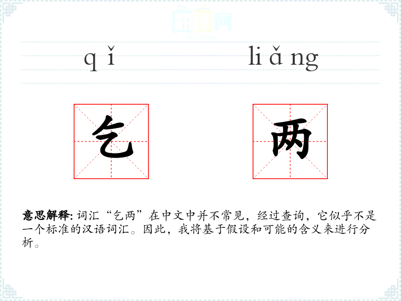 假设“乞两”是一个方言词汇或古汉语词汇,它的字面意思可能是“乞求两样东西”或“乞讨两次”。这里的“乞”通常指乞求或乞讨,而“两”则表示数量上的二。