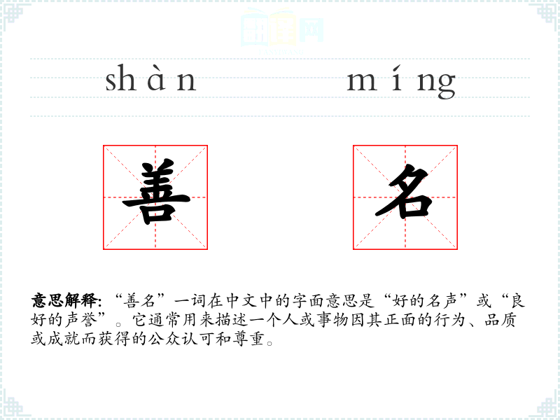“善名”一词在中文中的字面意思是“好的名声”或“良好的声誉”。它通常用来描述一个人或事物因其正面的行为、品质或成就而获得的公众认可和尊重。