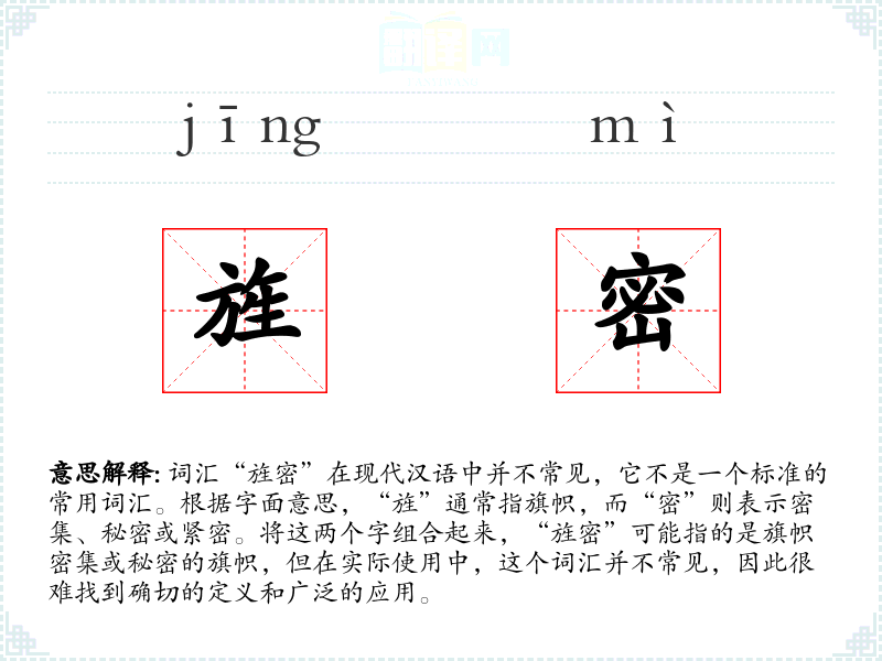 由于“旌密”不是一个标准词汇,我们无法提供一个确切的基本定义。它可能是某个特定领域或方言中的词汇,或者是某个特定文献中的创造性用法。