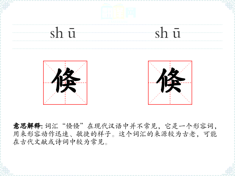 词汇“倏倏”在现代汉语中并不常见,它是一个形容词,用来形容动作迅速、敏捷的样子。这个词汇的来源较为古老,可能在古代文献或诗词中较为常见。