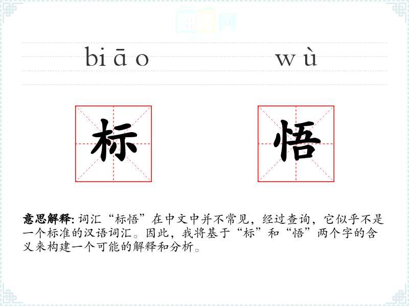 词汇“标悟”在中文中并不常见,经过查询,它似乎不是一个标准的汉语词汇。因此,我将基于“标”和“悟”两个字的含义来构建一个可能的解释和分析。