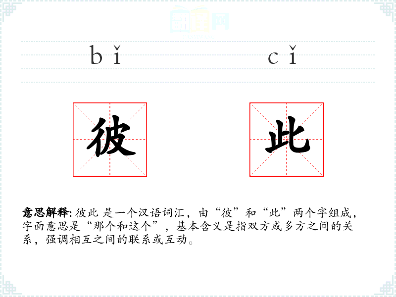 彼此 是一个汉语词汇,由“彼”和“此”两个字组成,字面意思是“那个和这个”,基本含义是指双方或多方之间的关系,强调相互之间的联系或互动。
