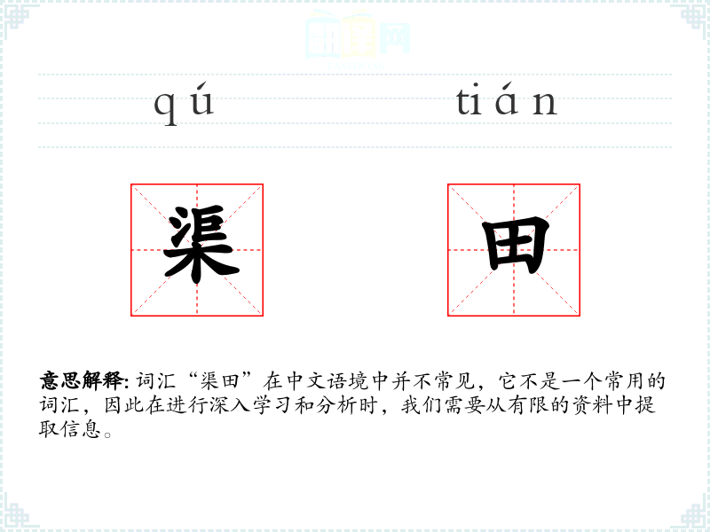 词汇“渠田”在中文语境中并不常见,它不是一个常用的词汇,因此在进行深入学*和分析时,我们需要从有限的资料中提取信息。
