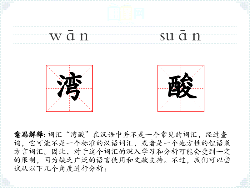 由于“湾酸”不是一个标准词汇,我们无法提供一个确切的基本定义。它可能是某个地区特有的词汇,用来描述某种特定的情感、物质或现象。