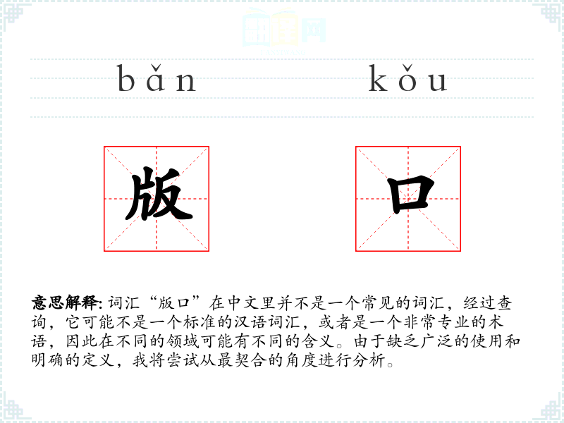 由于“版口”不是一个标准词汇,我们无法给出一个确切的字面意思和基本含义。它可能是某个特定行业或地区的术语,或者是某个特定语境下的用语。