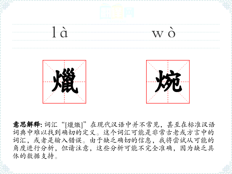 由于“[爉燩]”不是一个标准的现代汉语词汇,我们无法提供一个确切的字面意思和基本含义。
