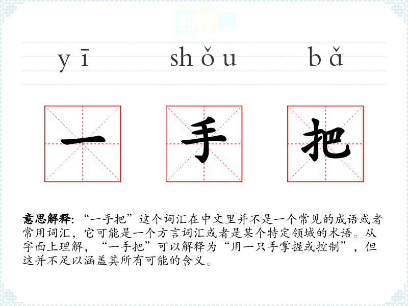 “一手把”这个词汇在中文里并不是一个常见的成语或者常用词汇,它可能是一个方言词汇或者是某个特定领域的术语。从字面上理解,“一手把”可以解释为“用一只手掌握或控制”,但这并不足以涵盖其所有可能的含义。
