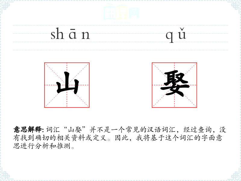 “山娶”字面意思可能是指“山”与“娶”两个字的组合。在这里,“山”通常指的是自然界中的山脉或高地,而“娶”则是指男子迎娶妻子。将这两个字组合起来,可能意味着某种与山有关的婚姻或迎娶仪式。