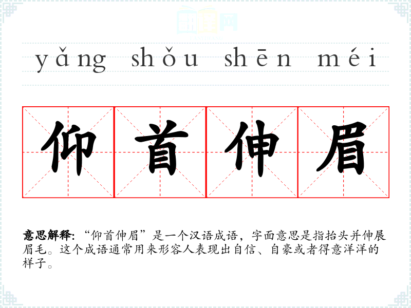 “仰首伸眉”是一个汉语成语,字面意思是指抬头并伸展眉毛。这个成语通常用来形容人表现出自信、自豪或者得意洋洋的样子。
