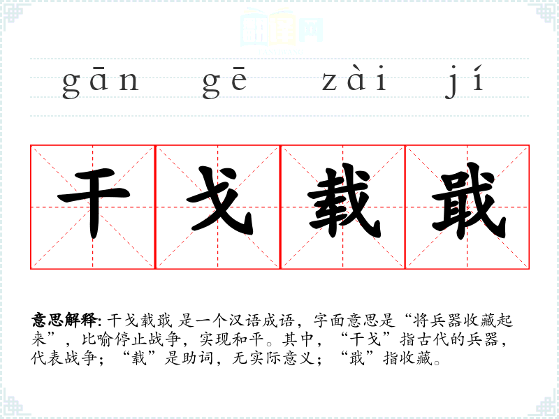 干戈载戢 是一个汉语成语,字面意思是“将兵器收藏起来”,比喻停止战争,实现和平。其中,“干戈”指古代的兵器,代表战争;“载”是助词,无实际意义;“戢”指收藏。