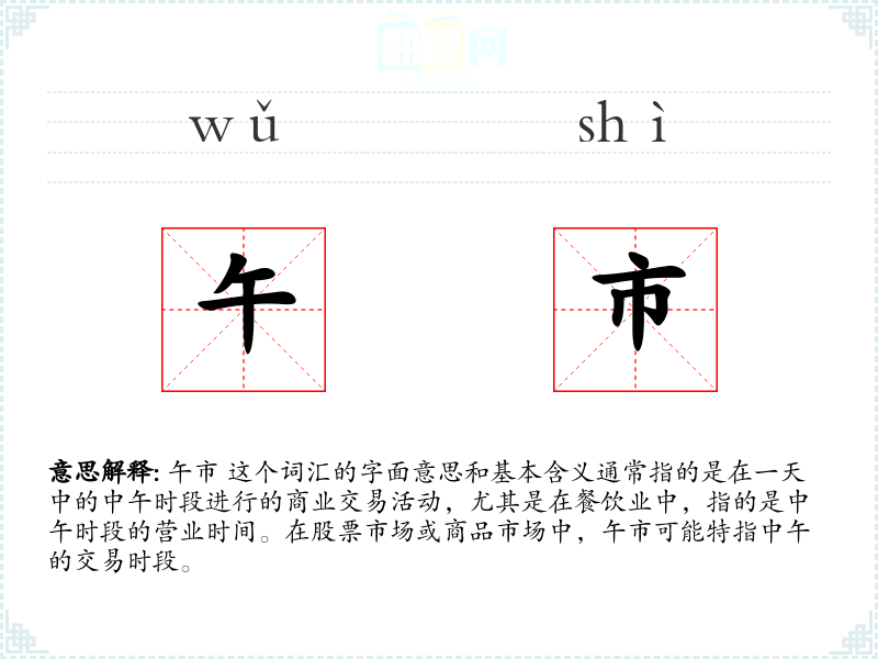 午市 这个词汇的字面意思和基本含义通常指的是在一天中的中午时段进行的商业交易活动,尤其是在餐饮业中,指的是中午时段的营业时间。在股票市场或商品市场中,午市可能特指中午的交易时段。