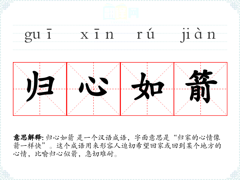 归心如箭 这个成语在汉语中是一个非常形象和生动的表达,它不仅描绘了人们归家的急切心情,也反映了家在*文化中的重要地位。在语言学和表达中,掌握这样的成语可以丰富我们的表达方式,使我们的语言更加生动和富有情感。