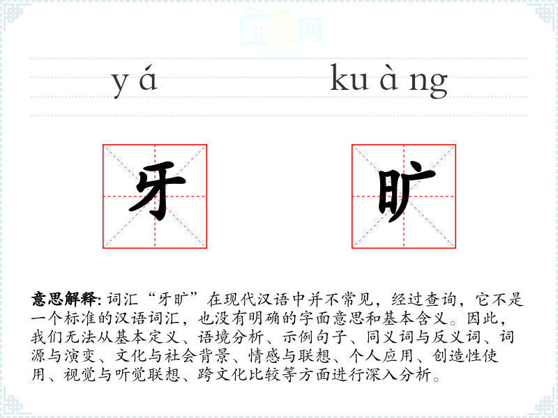 词汇“牙旷”在现代汉语中并不常见,经过查询,它不是一个标准的汉语词汇,也没有明确的字面意思和基本含义。因此,我们无法从基本定义、语境分析、示例句子、同义词与反义词、词源与演变、文化与社会背景、情感与联想、个人应用、创造性使用、视觉与听觉联想、跨文化比较等方面进行深入分析。
