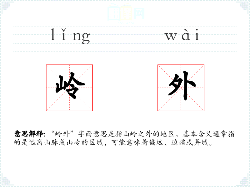 “岭外”字面意思是指山岭之外的地区。基本含义通常指的是远离山脉或山岭的区域,可能意味着偏远、边疆或异域。