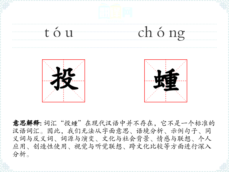 词汇“投蝩”在现代汉语中并不存在,它不是一个标准的汉语词汇。因此,我们无法从字面意思、语境分析、示例句子、同义词与反义词、词源与演变、文化与社会背景、情感与联想、个人应用、创造性使用、视觉与听觉联想、跨文化比较等方面进行深入分析。