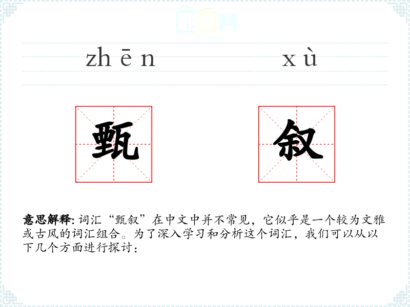 词汇“甄叙”在中文中并不常见,它似乎是一个较为文雅或古风的词汇组合。为了深入学*和分析这个词汇,我们可以从以下几个方面进行探讨:
