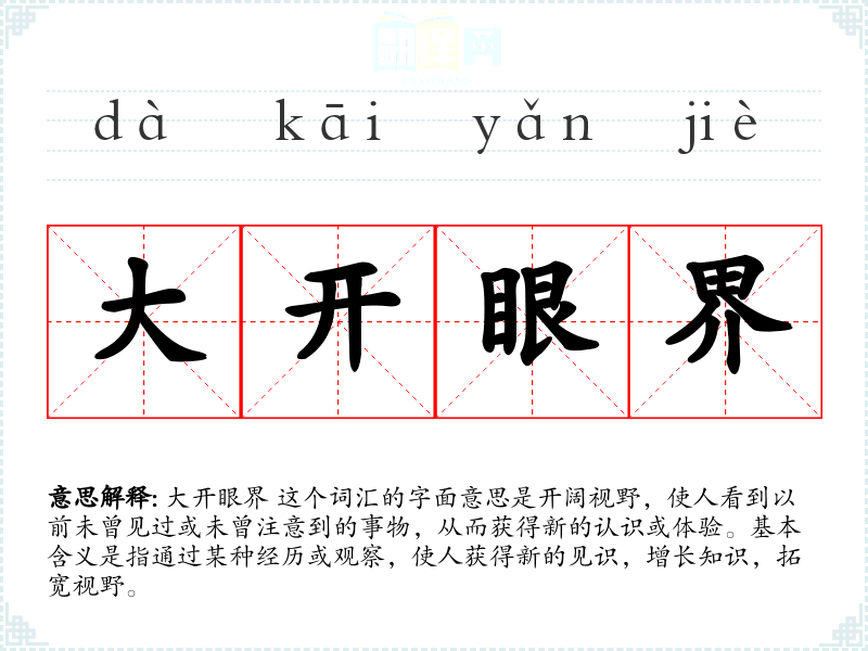 大开眼界 这个词汇的字面意思是开阔视野,使人看到以前未曾见过或未曾注意到的事物,从而获得新的认识或体验。基本含义是指通过某种经历或观察,使人获得新的见识,增长知识,拓宽视野。