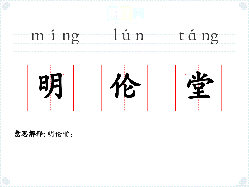 - 字面意思:明伦堂的字面意思是“明晰伦理的场所”。其中,“明”意为明晰、清楚,“伦”指伦理、道德,“堂”通常指一个建筑物或场所。
