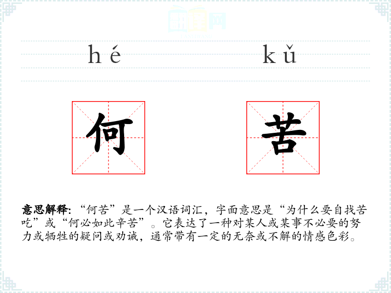 “何苦”是一个汉语词汇,字面意思是“为什么要自找苦吃”或“何必如此辛苦”。它表达了一种对某人或某事不必要的努力或牺牲的疑问或劝诫,通常带有一定的无奈或不解的情感色彩。