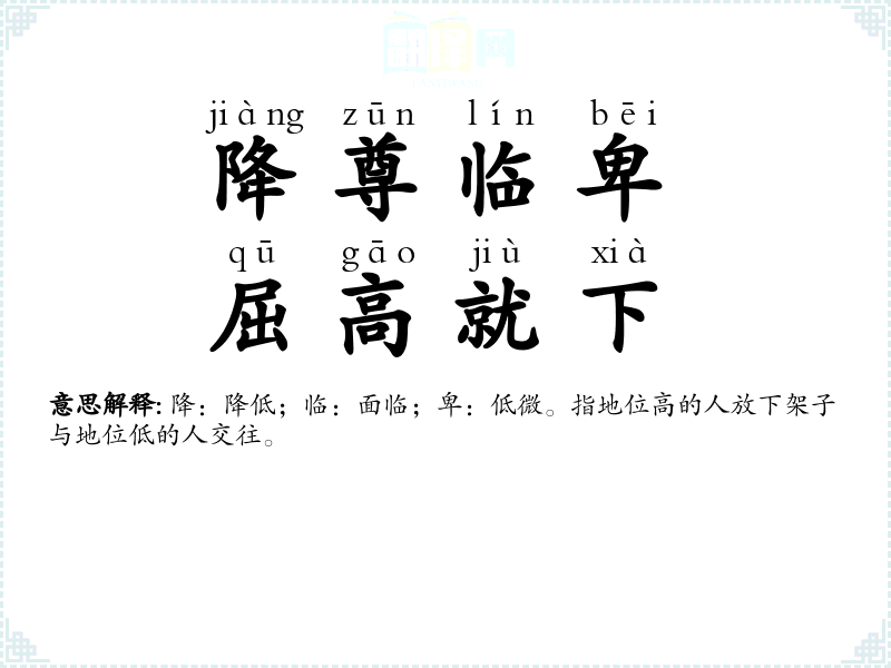 降:降低;临:面临;卑:低微。指地位高的人放下架子与地位低的人交往。