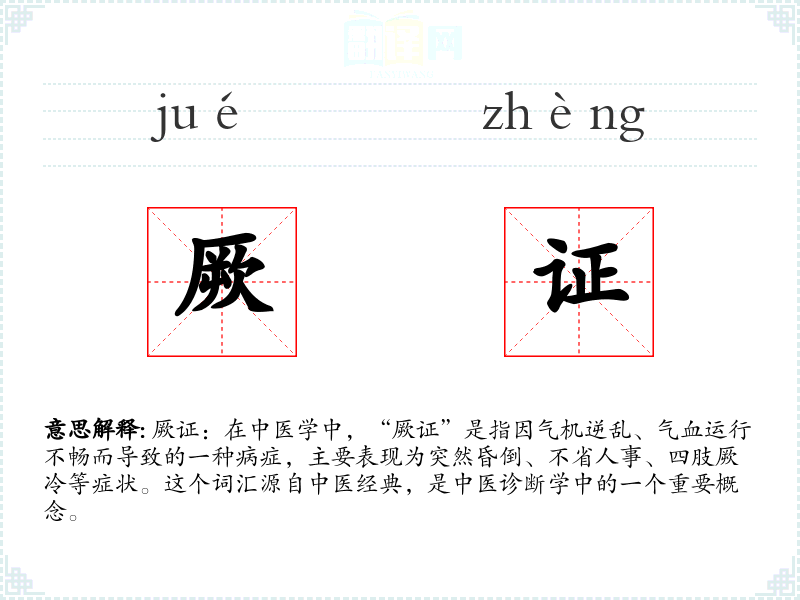厥证:在中医学中,“厥证”是指因气机逆乱、气血运行不畅而导致的一种病症,主要表现为突然昏倒、不省人事、四肢厥冷等症状。这个词汇源自中医经典,是中医诊断学中的一个重要概念。