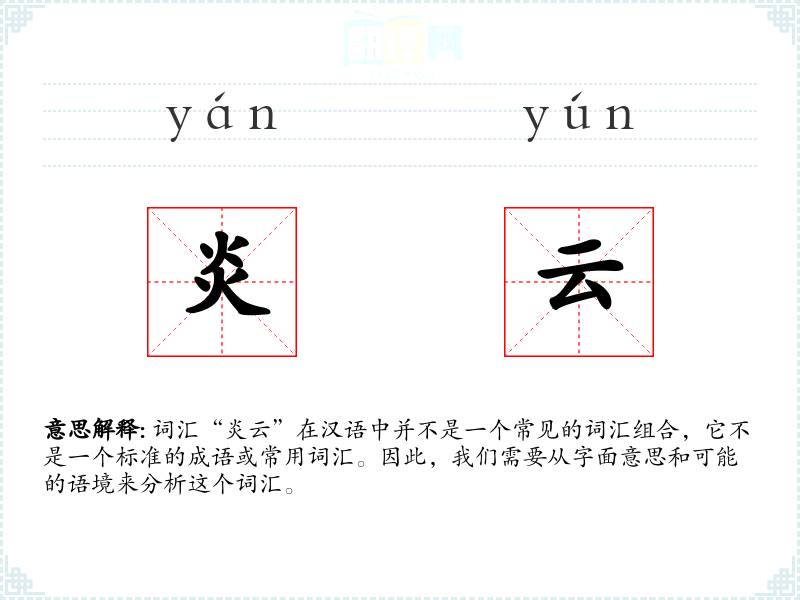 词汇“炎云”在汉语中并不是一个常见的词汇组合,它不是一个标准的成语或常用词汇。因此,我们需要从字面意思和可能的语境来分析这个词汇。