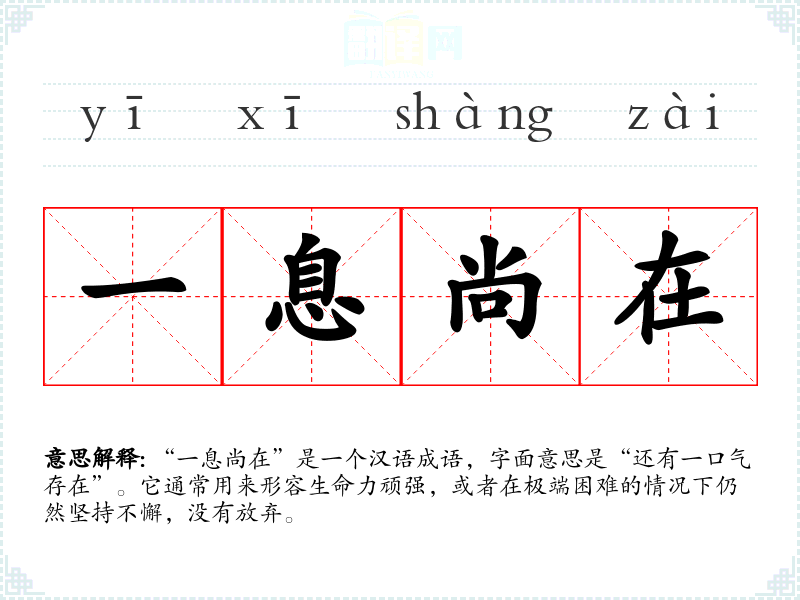 “一息尚在”是一个汉语成语,字面意思是“还有一口气存在”。它通常用来形容生命力顽强,或者在极端困难的情况下仍然坚持不懈,没有放弃。