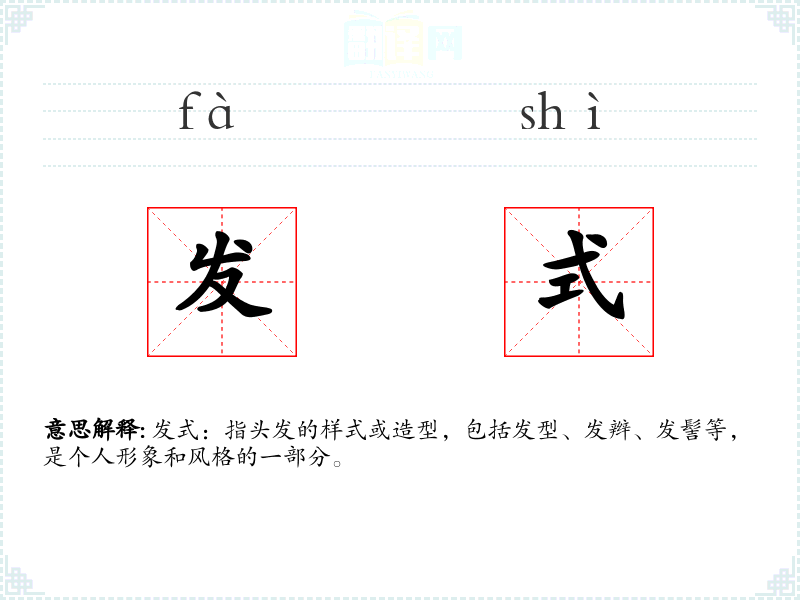 - 词源:发式一词源于汉语,由“发”和“式”两个字组成,分别表示头发和样式。