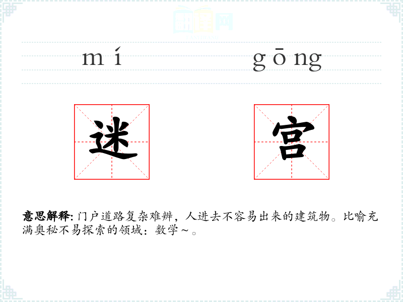 门户道路复杂难辨,人进去不容易出来的建筑物。比喻充满奥秘不易探索的领域:数学~。