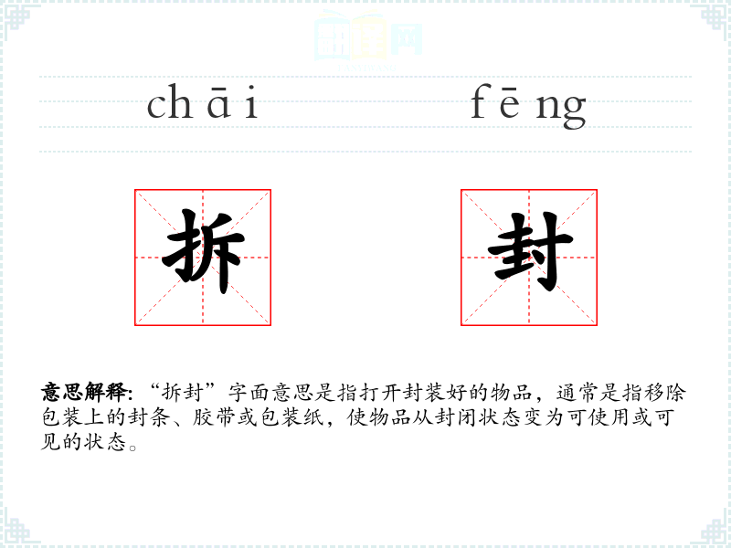 “拆封”一词由“拆”和“封”两个字组成。在古代,“封”常指封闭、封存,而“拆”则是打开、分离的意思。随着时间的推移,这两个字结合形成了现代汉语中的“拆封”一词。