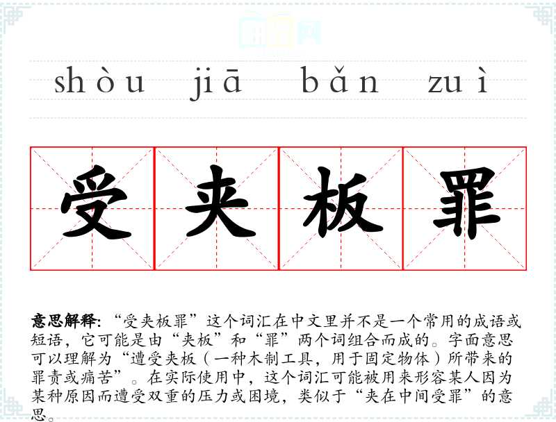 “受夹板罪”这个词汇可能是近年来网络用语或特定社群中的创造性表达,它的词源和演变过程不太明确。由于它不是一个传统的中文成语,它的使用和流行可能受到特定文化现象或社会**的影响。