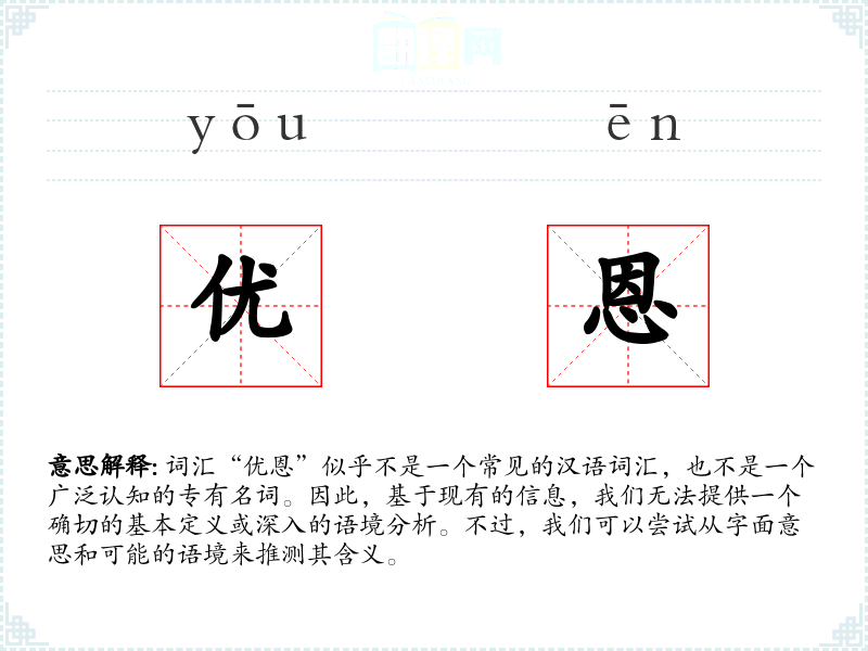 如果“优恩”是一个合成词,它可能由“优”和“恩”两个字组成。在中文中,“优”通常表示优秀、优良,而“恩”则表示恩惠、恩典。结合起来,“优恩”可能指的是一种优秀的恩惠或恩典。