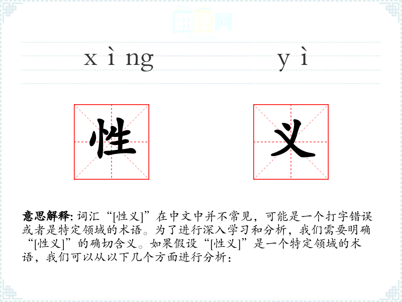 词汇“[性义]”在中文中并不常见,可能是一个打字错误或者是特定领域的术语。为了进行深入学习和分析,我们需要明确“[性义]”的确切含义。如果假设“[性义]”是一个特定领域的术语,我们可以从以下几个方面进行分析: